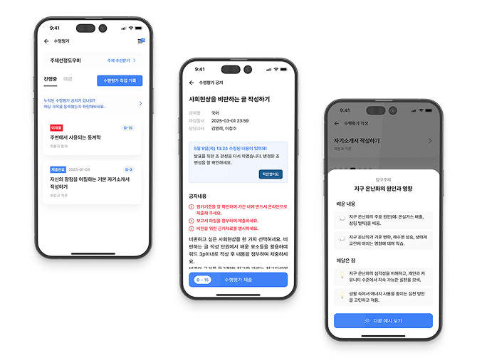 과목별 수행평가를 손쉽게 만들고 학생들의 제출내용을 한눈에 확인할 수 있습니다