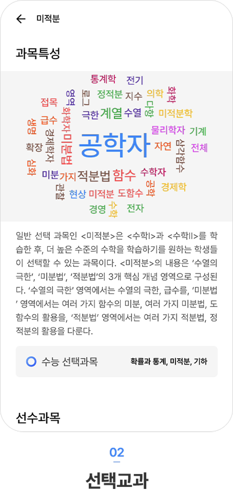 목표한 진로와 연계하여 수강이 필요한 선택교과를 확인하고 정리할 수 있는 기능