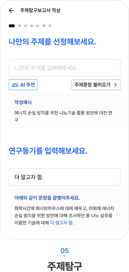 AI가 추천하는 탐구주제와 필요 활동을 확인하면서 나만의 주제문장 작성