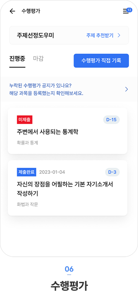 수행평가 내용을 확인하고 간편하게 결과물 제출